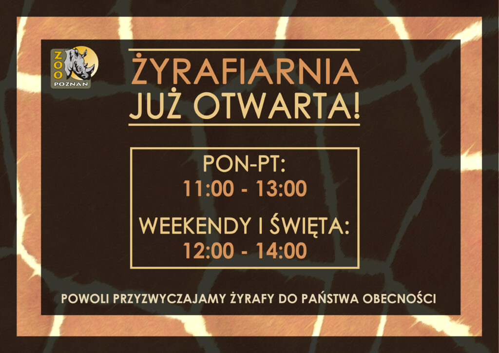 Budynek Nowej Żyrafiarni jest dostępny dla zwiedzających. Na razie przez dwie godziny dziennie – w godzinach od jedenastej do trzynastej w dni robocze i w godzinach od dwunastej do czternastej w soboty i dni wolne od pracy. Ograniczenia godzinowe wynikają z bardzo długiego procesu przyzwyczajania się żyraf do obecności ludzi za szybą ich pomieszczenia wewnętrznego. Dziękujemy w ich i swoim imieniu za wyrozumiałość.