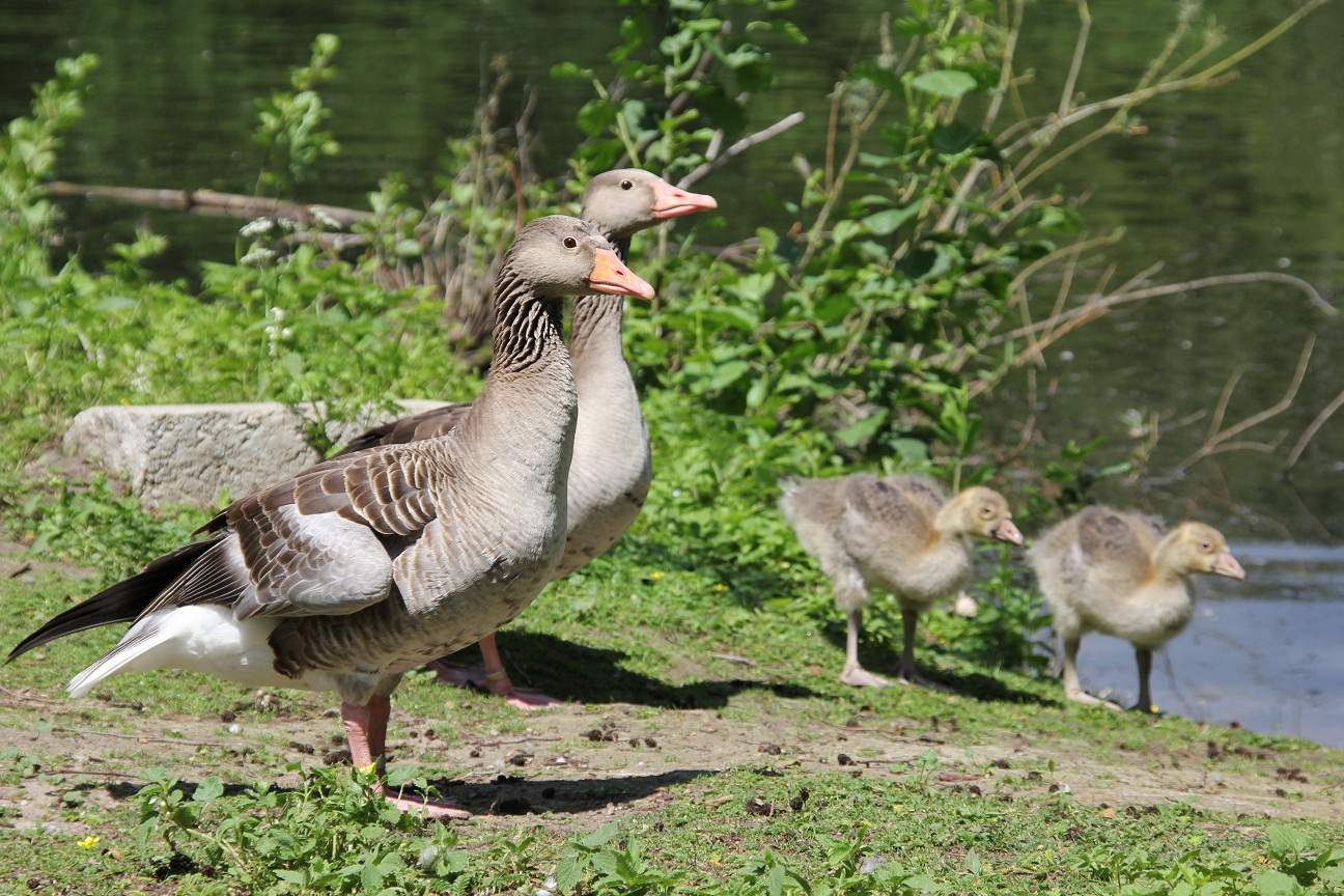 samiec idą na przedzie stadka, pośrodku pisklęta, na końcu kroczy drugi z