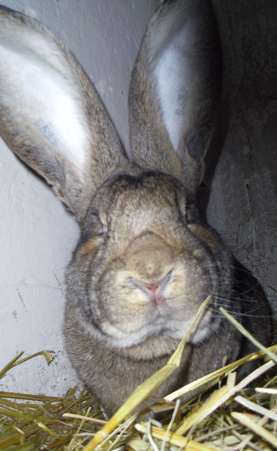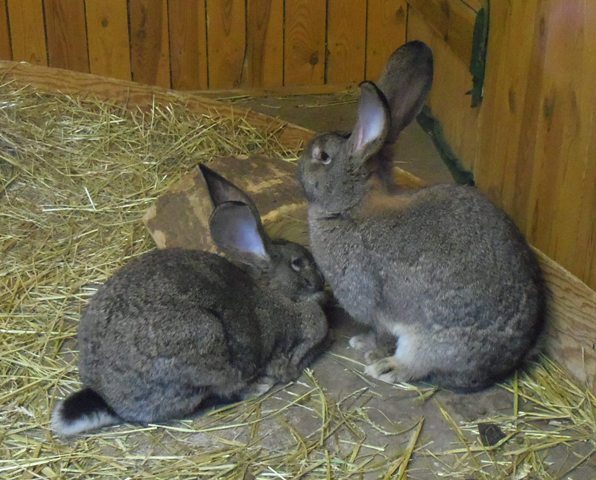 czyli króliki rasy belgijski olbrzym szary. Jest to najstarsza i największa z ras królików hodowlanych - dorosłe mogą osiągać 70 - 90 cm długości i ważyć ponad 7 kg! Belgijskie olbrzymy po raz pierwszy uzyskano we Flandrii, hoduje się je w różnych odmianach barwnych - u nas zobaczyć można odmianę szarą.