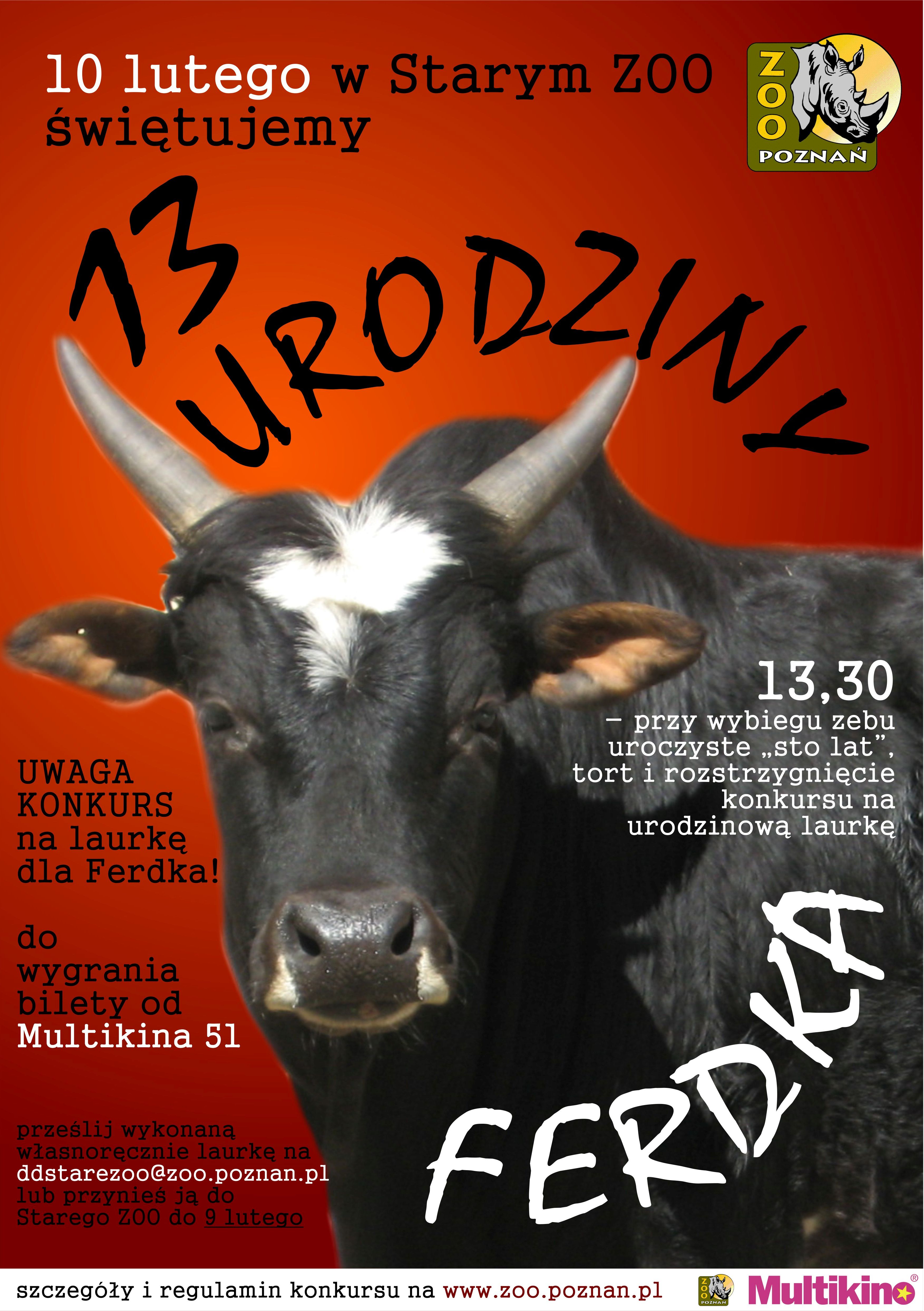 10 lutego o godz. 13.30 będziemy w Starym ZOO świętować 13 urodziny naszego byczka zebu – Ferdka! Nie zabraknie specjalnego tortu urodzinowego i odśpiewania „sto lat”. A ponieważ nie ma urodzin bez życzeń mamy propozycję – każdy kto wykona i prześle nam lub przyniesie do Starego ZOO laurkę urodzinową dla Ferdka, weźmie udział w konkursie! Na zwycięzców – autorów trzech najpiękniejszych laurek (wybranych komisyjnie przez jury) – czekają trzy podwójne zaproszenia do Multikina na dowolny film, do wykorzystania do końca 2018 roku (Ferdek oczywiście poleca film o jego „kuzynie”, „Fernando” ;-) ). Laurki – wykonane dowolną techniką – prosimy przesyłać na adres ddstarezoo@zoo.poznan.pl lub przynosić do Starego ZOO (do biura, działu dydaktycznego lub kasy Starego ZOO) do dnia 9 lutego włącznie. Laurki prosimy koniecznie zaopatrzyć w imię i nazwisko autora, jego wiek, adres e-mail i telefon kontaktowy oraz podpisane oświadczenie: „Wyrażam zgodę na przetwarzanie moich danych osobowych dla potrzeb niezbędnych do realizacji konkursu „Laurka dla Ferdka” zgodnie z ustawą z dnia 29.08.1997 r. o ochronie danych osobowych (Dz.U. z 2002 r. nr 101, poz. 926 z późn. zm.)”