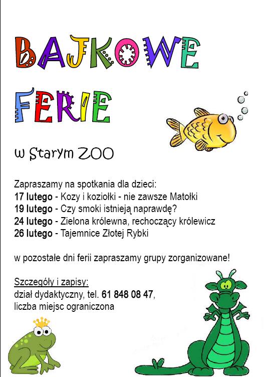Skąd wzięły się w bajkach smoki? Może istnieją naprawdę? Kim są zaczarowane królewny i królewicze? Czy możemy spotkać prawdziwą Złotą Rybkę? Na te i inne pytania, związane ze zwierzętami pojawiającymi się w bajkach, postaramy się znaleźć wspólnie odpowiedź w czasie „Bajkowych ferii w Starym ZOO”. Na zajęciach będzie czas na bliższe poznanie bohaterów dnia – gadów, płazów, rybek i kóz, mieszkających w naszym ZOO, będą też zajęcia plastyczne, na których nauczymy się, jak w prosty sposób można te zwierzaki narysować.