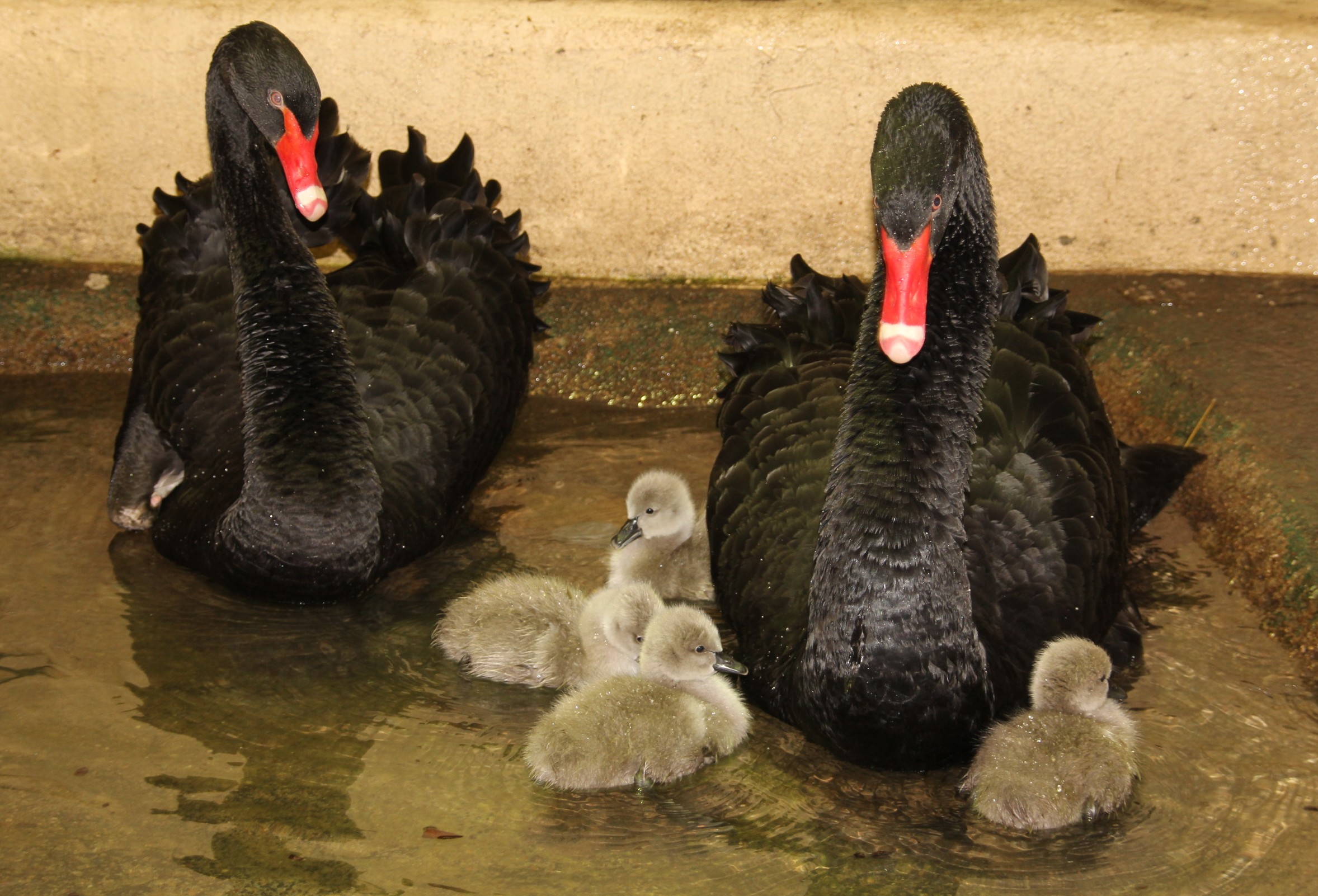 Nasza samica wytrwale siedziała na gnieździe, zbudowanym na wyspie. Z tego powodu opiekunowie zwlekali z przeniesieniem pary łabędzi na ciepłe zimowisko, niecierpliwie wyczekując pojawienia się piskląt. Wreszcie, 28 listopada wykluła się czwórka puchatych, szarych „brzydkich kaczątek”. Dwa dni później cała łabędzia rodzina trafiła do bezpiecznego, ciepłego pomieszczenia przy dużej wolierze, gdzie będzie je można oglądać przez ok. miesiąc. Resztę zimy spędzą, podobnie jak gęsi i kaczki ze Starego ZOO, na zimowisku w Nowym ZOO.